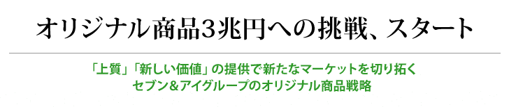2012年12月12日、セブン&アイHLDGS.はセブンプレミアムおよびグループ各社のオリジナル商品のさらなる拡大に向け、今後の商品戦略について発表会を行いました。その席上で鈴木敏文会長は、今までにない新しい価値、「上質」の商品・サービスをお客様に提供し続けることで、2015年にはセブンプレミアムの売上げを1兆円に、さらにグループ各社のオリジナル商品を含めた売上げを3兆円に伸ばすことを宣言しました。