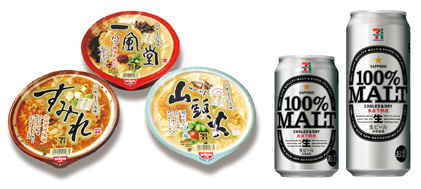 セブンゴールドのカップ麺と初のPBビール「セブンプレミアム 100%モルト」。