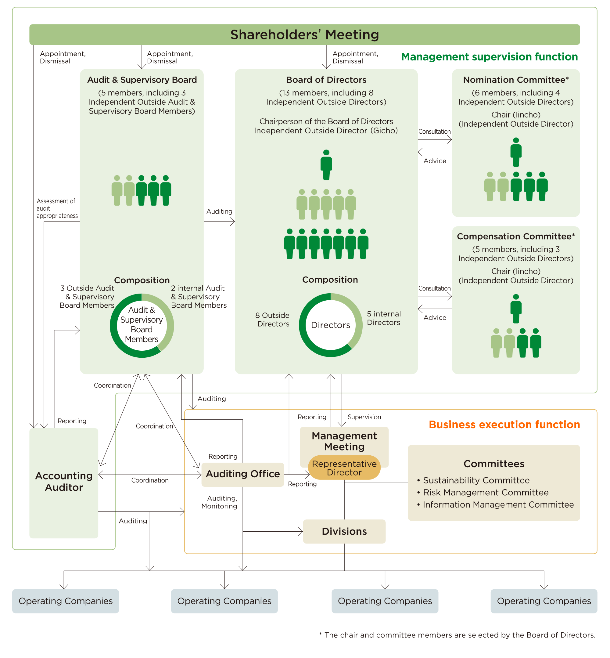 The Company has established the “Nomination Committee” and the “Compensation Committee” (in this paragraph, “the Committees”) as advisory committees to the Board of Directors. The Committees' chair and the majority of their members are Independent Outside Directors. It has been utilizing the more diverse range of knowledge and advice of Outside Directors and Outside Audit & Supervisory Board Members to ensure further objectivity and transparency in procedures for deciding the nomination of and compensation for Representative Directors, Directors, Audit & Supervisory Board Members, and executive officers (in this paragraph, “Officers, etc.”), thereby enhancing the supervisory functions of the Board of Directors and further substantiating corporate governance functions.