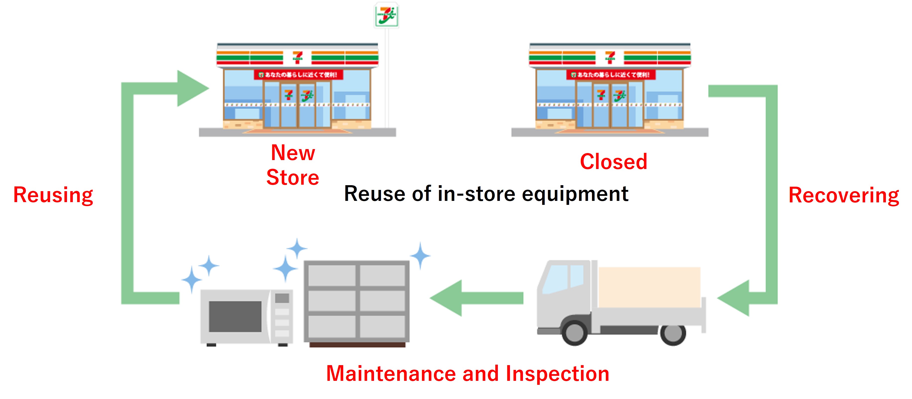Seven-Eleven Japan collects in-store equipment, such as refrigerated cases, from closed stores and, after cleaning, refurbishing, and inspecting them, promotes their reuse in new stores.