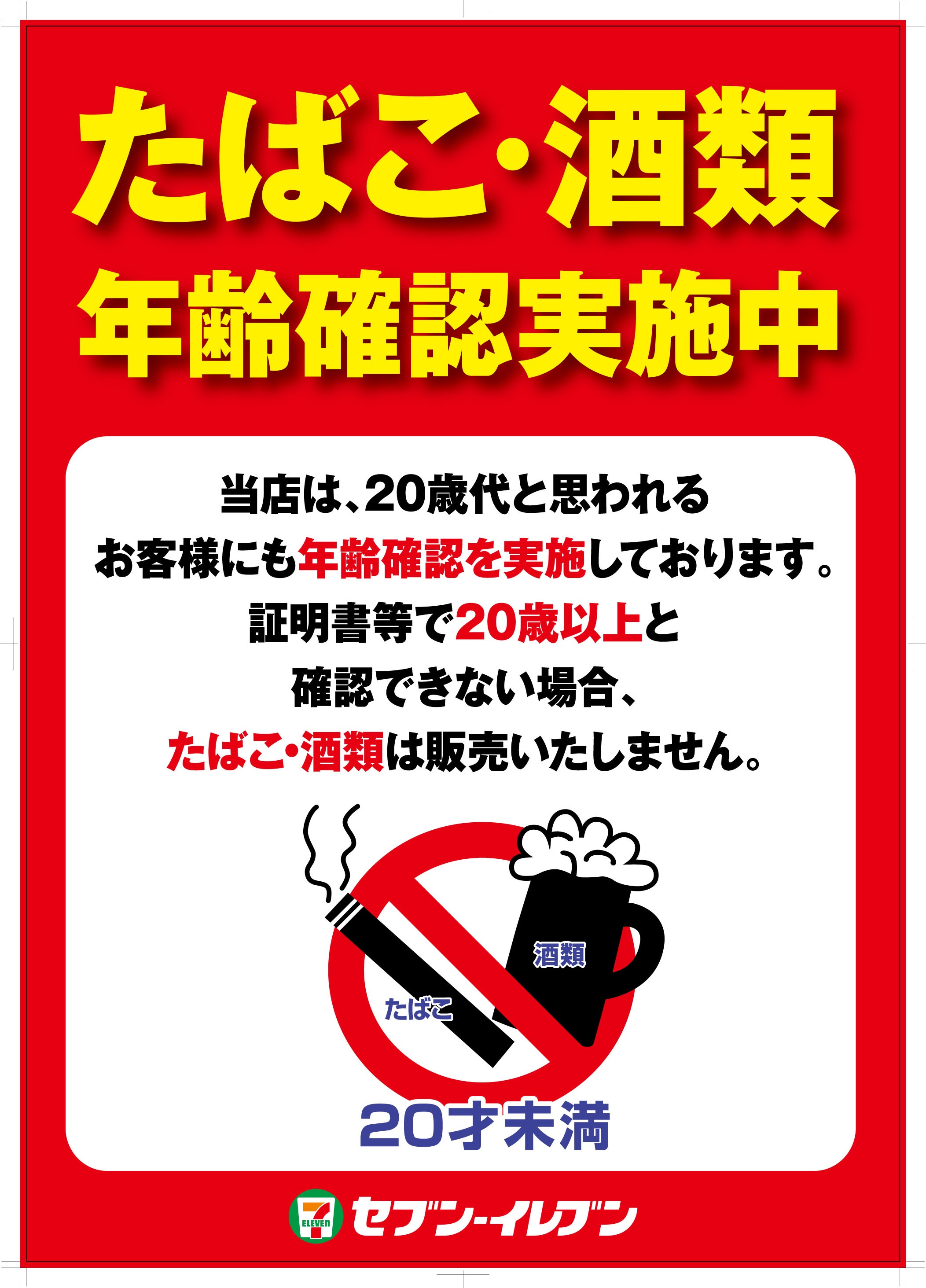7-Eleven stores put up posters stating "Age verification is being conducted" near the checkout counters selling alcoholic beverages and tobacco and verify the age of purchasers who seem under 20 and 20s with their identification card. Besides, in cooperation with the Japan Franchise Association, Seven-Eleven Japan has established 3 months a year as a month of strengthening age verification at the time of sales of alcoholic beverages and tobacco. Seven-Eleven Japan educates and enlightens its franchisee employees not to sell them to anyone under the age of 20.
