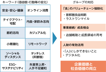 グループ各社はお客様の行動変容と価値観の変化に誠実に対応し、「with/afterコロナ」の時代のニューノーマルと呼ばれる新たな生活のあり方に、グループシナジーを活かして積極的にお応えしようとしています。