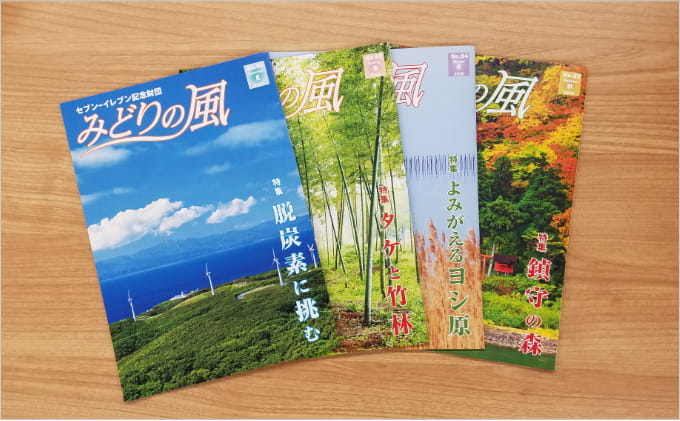 中でも注目したいのは、広報誌『みどりの風』です。毎号、自然が身近に感じられるさまざまな特集を組んでおり、その内容の濃さが評判を呼んでいます。また、森林認証制度に即した再生紙を使用しているのに加え、封筒を使わない簡易包装システム「エコメール便」を採用しており、配送においても環境に配慮しています。ちなみに、発行部数は約2万5,000部で、助成先団体様をはじめ、一部の行政や希望される個人の皆様、セブン‐イレブンの店舗にも配布されています。
