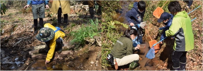 高尾の森自然学校での「最初の一滴採取」(左)と、「生きものしらべ」の模様(右)「海で魚が獲れるのは、森の栄養分が川を通って海に流れ込むからです。それゆえ、森の整備は非常に大切。気仙沼の森づくりで有名な合言葉『森は海の恋人』とは、そういう意味を持っています。『高尾の森自然学校』の活動を通じて森や海との共存を意識し、昔より薄れてしまった自然を大切にする思いを、もう一度広めていきたいです」