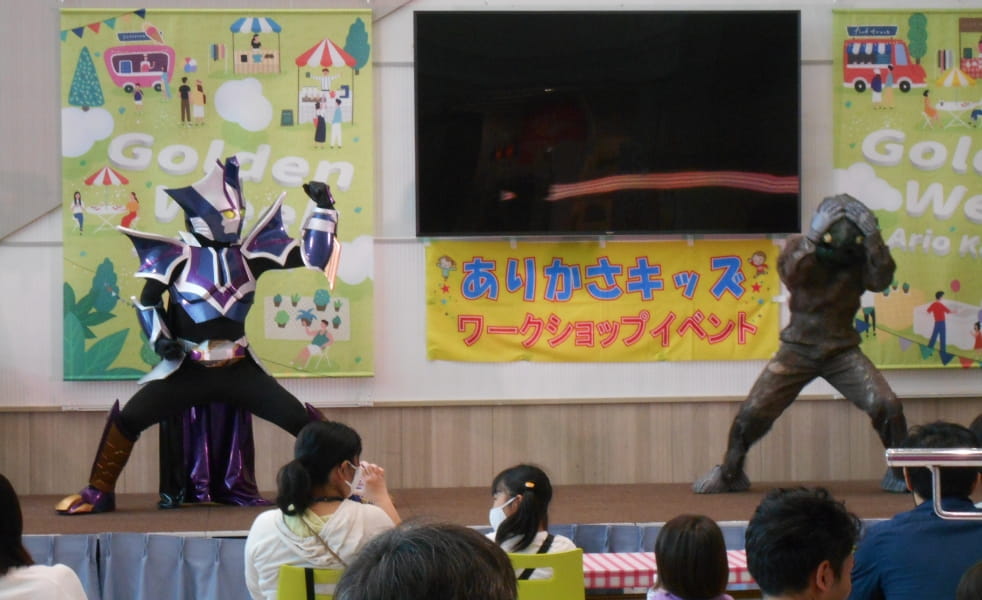アリオ葛西では、アクション科および小道具を作る学生様の有志で、キッズ対象イベントのミニヒーローショー&盾型ブレスレットづくりを開催しました。このような専門学校コラボワークショップは昨年度より実施しており、今年のイベントにはお子様66名(付き添いを含め約100名)の方にお越しいただき、参加者にはお買い物200円券を配布しました。