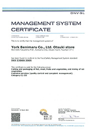 ヨークベニマルは、2018年3月にヨークベニマル大槻店(福島県郡山市)において、国際的な食品安全マネジメントシステムである「ISO22000」の認証を取得。その後、認証範囲をヨークベニマル本部まで拡大し、認証を取得しました。今後は、ISO 22000の認証取得の経験を活かし、各店舗の従業員教育を実施しながら、HACCPシステムを全店に導入するとともに、地域のお客様の食卓のさらなる安全・安心を実現するために、商品の仕入れから販売までの品質改善により一層努めていきます。